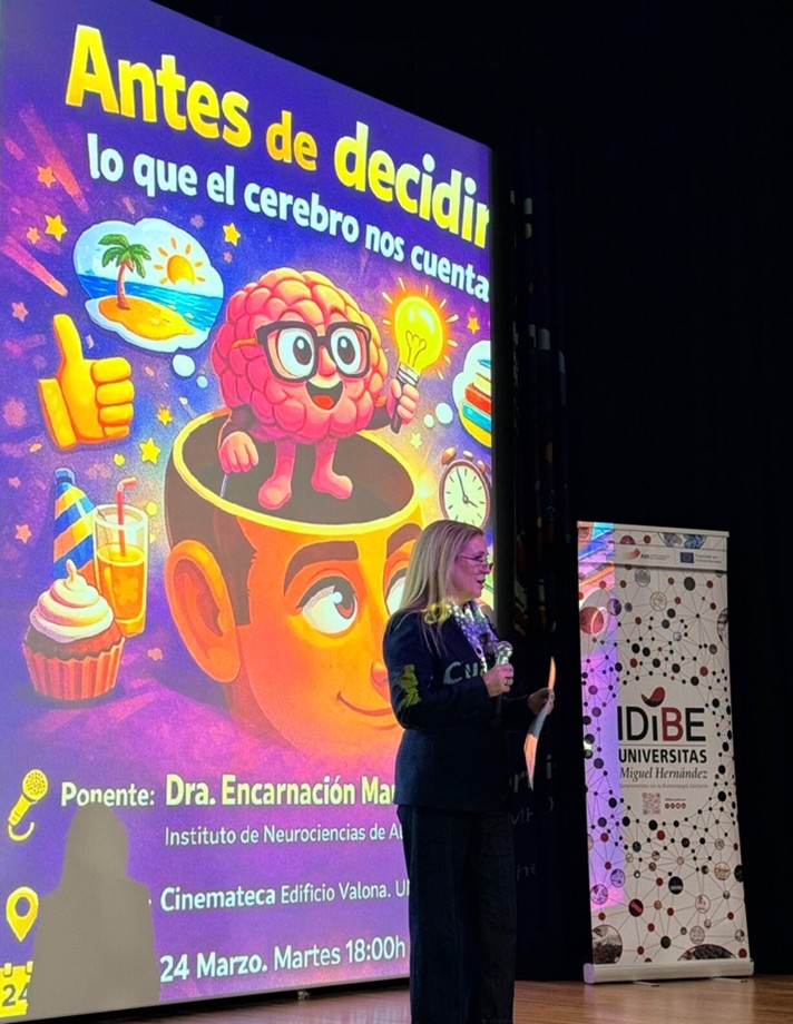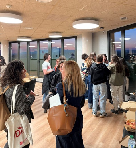 The program included a lecture by Dr. Encarni Marcos Sanmartín, from the Neural Network Plasticity research group at the Alicante Institute of Neuroscience (UMH–CSIC), entitled “Before Deciding What Our Brain Tells Us.” The presentation inspired a lively and stimulating discussion, which later continued informally on the rooftop terrace of UMH’s Valona Building—offering a splendid view of the sunset and the iconic palm grove of Elche. The event concluded convivially with pizza provided by Domino’s, fostering the scientific dialogue.