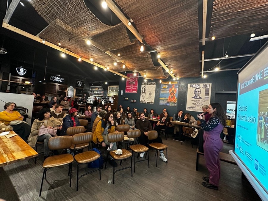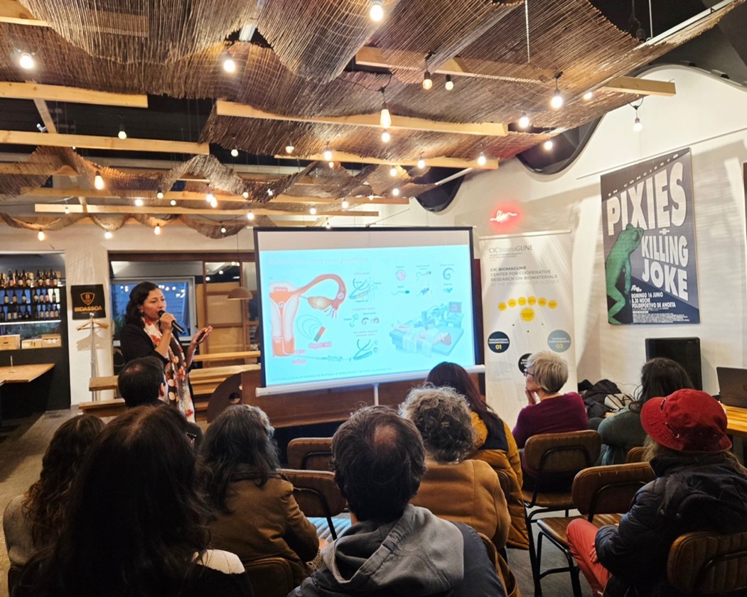 This year’s edition took place at Bidassoa Taproom in the Gros neighborhood, where attendees gathered to enjoy two short talks delivered by local researchers. Mariana Medina, group leader of the Nanobiosystems group at CIC nanoGUNE, presented her work on nanorobots applied to fertility treatments, offering insight into how advances in nanoscience may open new possibilities in reproductive medicine. Liliana Teixeira, postdoctoral researcher at the Biomolecular Nanotechnology Laboratory at CIC biomaGUNE, followed with a talk on protein libraries and their potential in the fight against viral diseases, highlighting innovative approaches at the intersection of biology and nanotechnology.