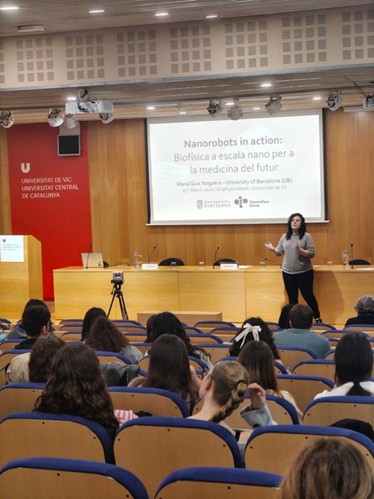 The event featured a plenary lecture by Dr. Maria Guix Noguera, a Ramón y Cajal researcher at the University of Barcelona, who delivered the talk Nanorobots in action: biophysics at the nanoscale for the medicine of the future. During her presentation, she explained the operating principles and fabrication processes of these biohybrid devices, as well as their ability to move and act within the human body.